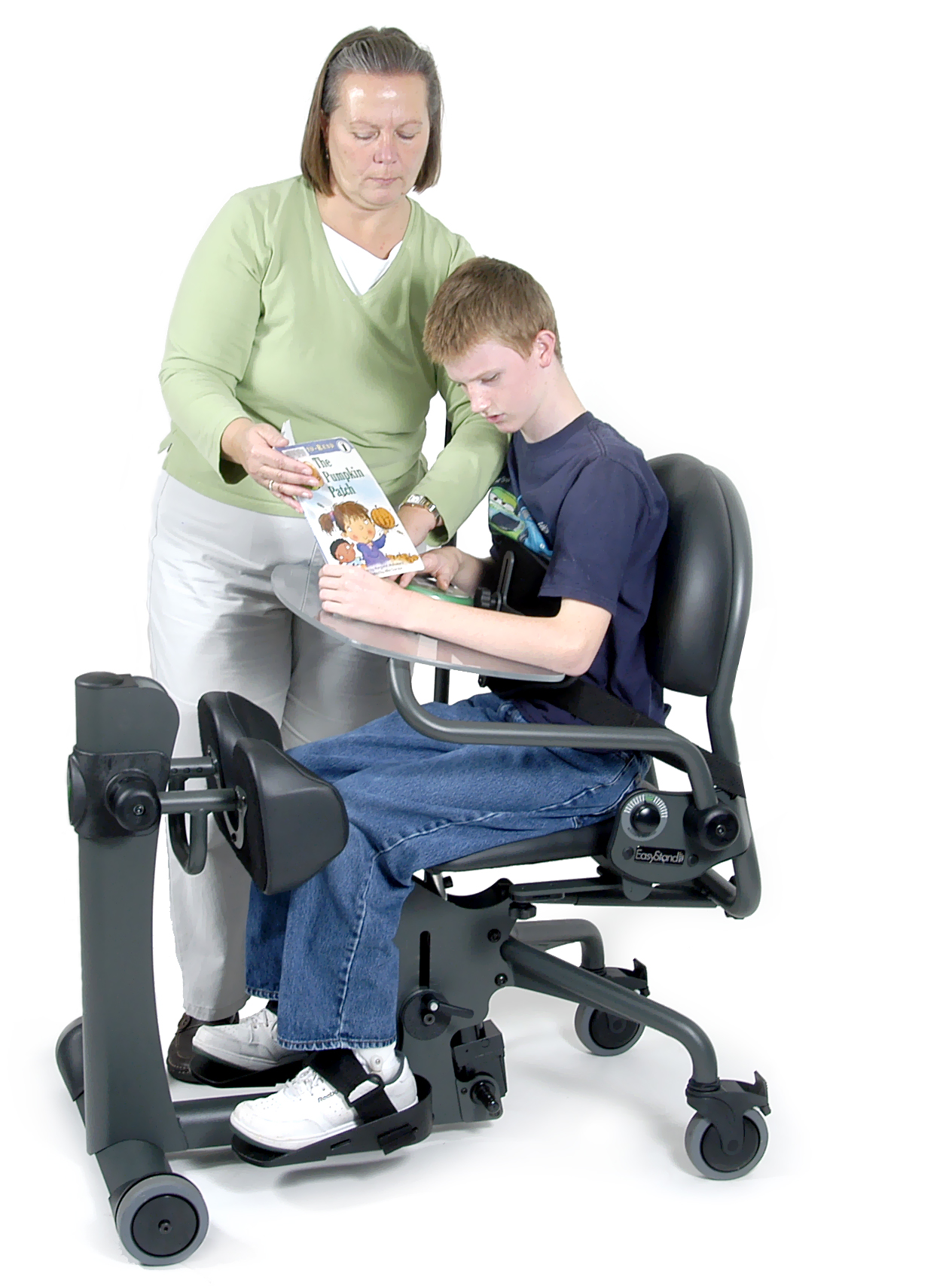 Die Therapiefunktionen können ohne zusätzlichen Transfer in die aktive Tagesplanung integriert werden. Dadurch dass der Therapietisch im Sitzen und auch im Stehen wie ein Schatten immer mitgeht, kann der Easy-Stand® gut in der Schule eingesetzt werden. Während des Unterrichts können die Beine immer wieder durchgestreckt werden.
